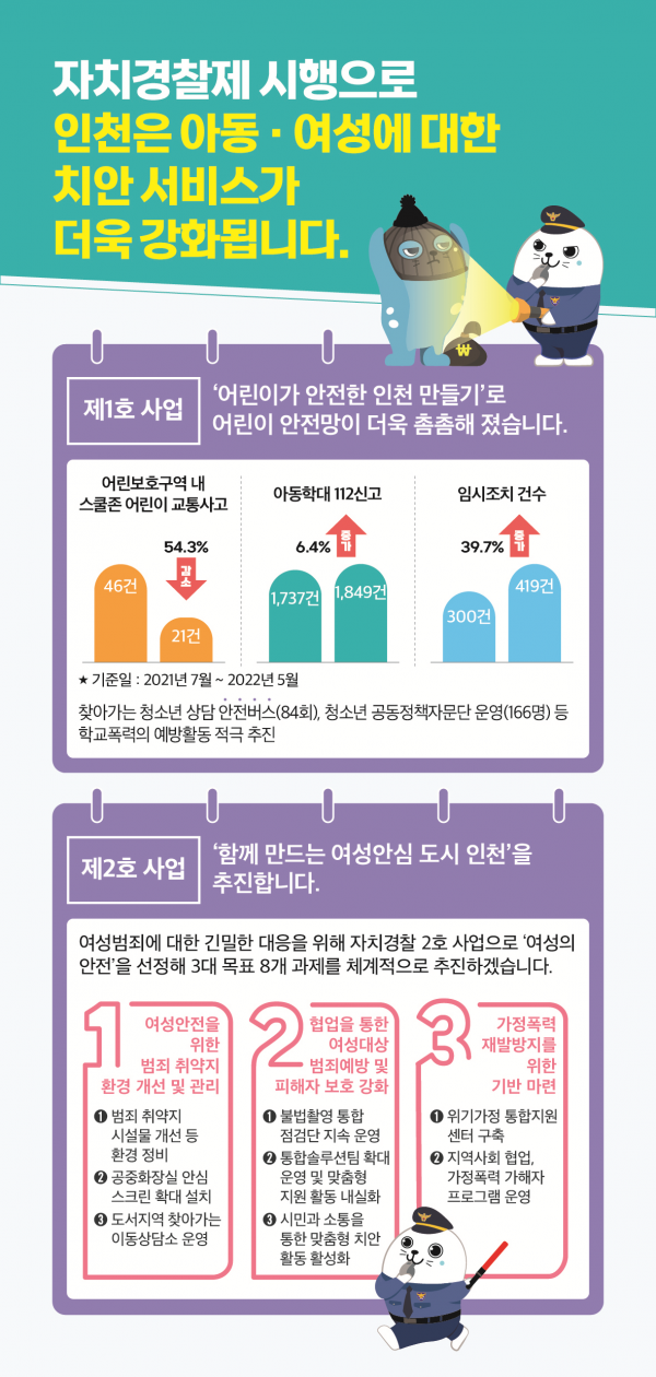 또, 스토킹 범죄 증가 등 여성범죄 발생에 따른 시민 불안감이 점차 높아짐에 따라, 여성 안전 환경 조성을 목표로 한 인천자치경찰 2호 사업‘함께 만드는 여성안심 도시 인천’에 대한 선정 배경 및 주요 치안정책에 대해 설명하며 시민 안전을 위해 함께 협력해 줄 것을 당부했다.