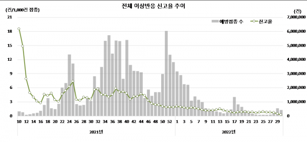 전체 예방접종 126,725,952건 중 이상반응은 473,755건이 신고됐으며 일반 이상반응은 454,896건, 중대한 이상반응은 18,859건이었다.