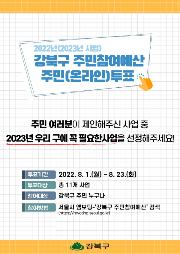 투표대상은 미아문화정보도서관 옥외휴게소 데크 재설치 으뜸 어린이공원 놀이터 내 운동기구 교체 친환경 해충기피제 자동 분사기 설치 우이초등학교 인근 바닥불빛이 나는 신호등 설치 한천로131길 외 2개소 도로정비 어르신 요실금 관리사업 AI/VR 면접체험관 운영 여성안심귀갓길 LED 도로명주소 설치 우이동 가족캠핑장 힐링공간 조성 자동식 공기주입기 설치 강북구 작은 도서관 공기청정기 설치 등 11개 사업이다.
