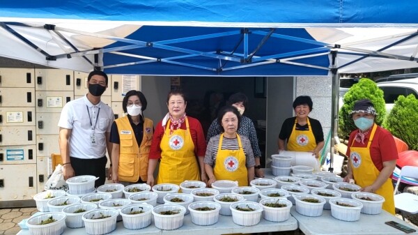 무더운 날씨에도 어려운 이웃을 돕기 위해 나선 대한적십자사 군자봉사회는 이른 아침부터 재료를 씻고 다듬으며 정성껏 열무김치를 담갔다.