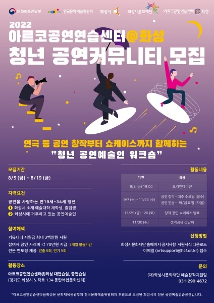 이번 프로그램의 모집기간은 8월 5일부터 19일까지며 모집대상은 만 19세 이상, 만 34세 미만의 화성시 거주 공연예술인 또는 화성시 소재 예술대학에 재학 중이거나 졸업한 청년 공연예술인이다.