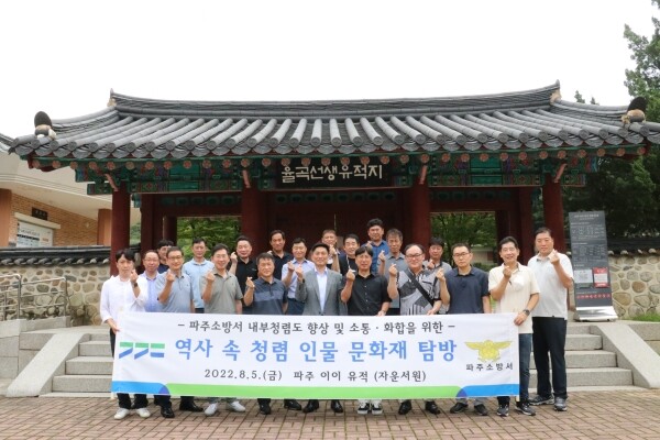 진행순서는 역사 속 청렴 유적지를 직접 탐방하며 우리 조상들의 청렴함을 몸소 느끼고 공무원으로서 갖추어야 할 정신 자세를 고취시킴과 동시에 파주소방서 간부들이 자유롭게 의견을 교환하고 소통하는 의미 있는 시간을 가졌다.