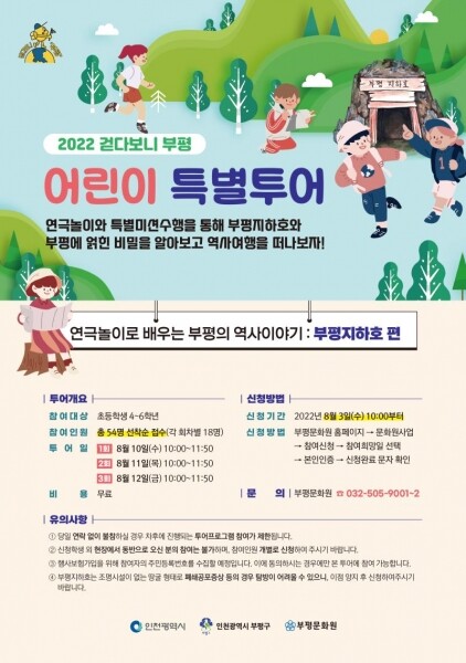 부평문화원 관계자는 “코로나19로 야외활동을 하기 어려웠던 어린이들이 이번 특별투어를 통해 부평구 함봉산 자락에 있는 부평지하호에서 특별한 임무를 수행하며 부평에 얽힌 비밀을 알아보고 역사의 주인공이 돼보길 바란다”고 말했다.