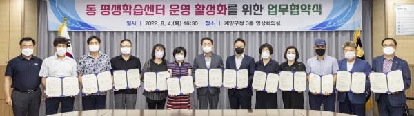 이번 업무협약은 동 평생학습센터 운영 활성화를 위해 주민자치센터를 운영하는 각 동 주민자치회와 계양구 평생학습문화를 확산하는 데 상호 협력하는 내용으로 이루어졌다.