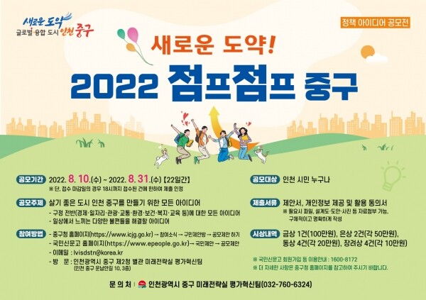이번 공모는 2020년 처음 개최한 ‘중구에 터져라, 아이디어 다이너마이트 ’제안 공모에 이어 세 번째 개최하는 것으로 올해 공모주제는‘살기 좋은 도시 인천 중구를 만들기 위한 모든 아이디어’이다.