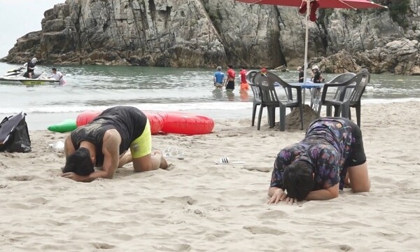 그런 두 사람이 난데없이 뙤약볕 아래에서 비지땀을 한 바가지 쏟으며 삽질을 시작, 이후 모래사장에 얼굴만 남기고 묻힌 두 사람의 모습이 포착돼 궁금증을 안긴다.