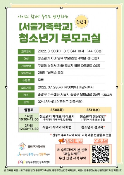 중랑구가족센터에서 운영하는 이번 교육은 사춘기 자녀의 특성과 심리상태를 이해하고 부모와 자녀간 관계 향상을 위한 자리다.