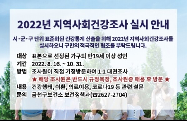 유성훈 금천구청장은 “올해도 작년에 이어 코로나19 방역수칙을 준수해 안전하게 조사할 것”이라며 “지역사회 건강조사는 금천구민 모두의 건강한 삶을 위한 중요한 조사이니만큼 표본으로 선정된 가구는 조사원 방문 시 외면하지 말고 적극적으로 참여하시기를 당부드린다”고 말했다.