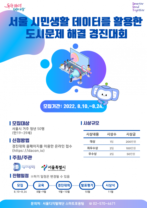 서울시와 서울디지털재단은 이달부터 11월까지 약 3개월에 걸쳐 ‘서울 시민생활 데이터를 활용한 도시문제 해결 경진대회’를 연다고 밝히고 참여 청년 50명을 10일~24일 모집한다.