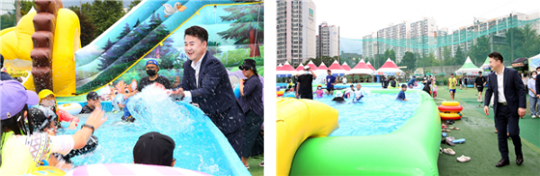 이날 오언석 구청장은 현장 점검뿐만 아니라 아이들에게 물을 뿌리기도 하고 기념 촬영에 응하기도 하며 주민들과 즐거운 시간을 함께했다.