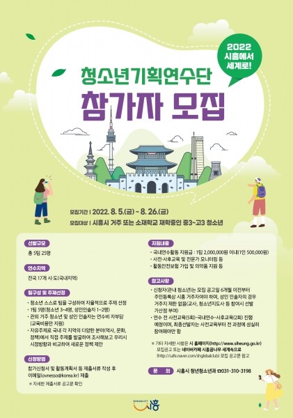 대상은 시흥시에 거주하거나, 소재학교에 재학 중인 중학교 3학년생에서 고등학교 3학년까지의 청소년이 해당되며 모집 규모는 총 5팀 25명이다.