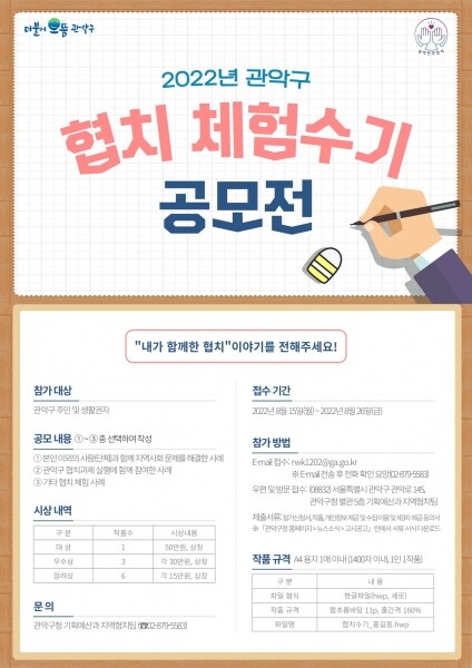 수상작은 9월 중 관악구청 홈페이지를 통해 발표하며 관악구의 협치 사례를 알리는 홍보 자료로 적극 활용할 계획이라고 전했다.