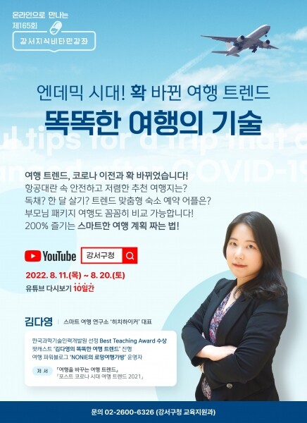이번 강좌는 사전 신청 없이 오는 11일부터 20일까지 누구나 강서구청 공식 유튜브 채널인 i강서tv에 접속해 시청할 수 있다.