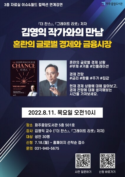 이번 강연은 중앙도서관 3층 자료실에서 진행하는 ‘글로벌 인플레이션: 경고등 켜진 S공포’ 주제 전시의 연계 강연으로 ‘혼란의 글로벌 경제와 금융시장’이라는 주제로 진행된다.