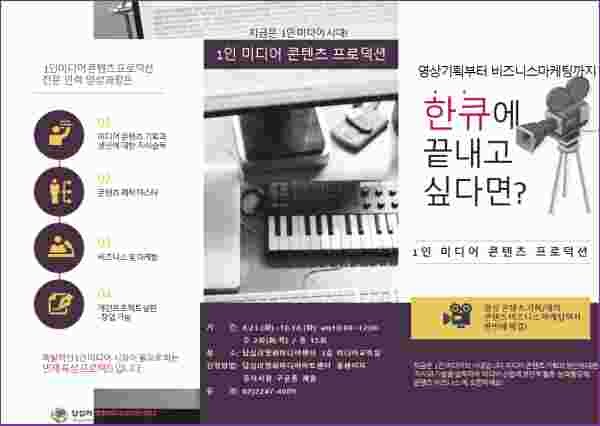 ‘1인 미디어 콘텐츠 프로덕션’은 1인 미디어산업에 생산적 활동능력을 갖춘 인재를 양성해 콘텐츠 비즈니스 마케팅까지 한 번에 해결할 수 있도록 마련된 교육 프로그램이다.