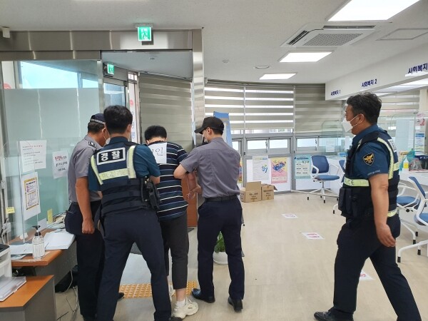 이날 훈련은 민원인의 위법행위 대응지침을 참고해 비상대응팀 구성, 민원인 폭언?폭행 발생, 민원인 진정 유도?제기, 비상벨 작동, 공무원 보호와 방문 민원인 피신, 민원인 경찰 인계 등 단계별 시나리오에 맞춰 진행됐다.