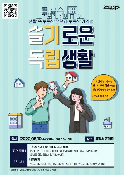첫 번째 특강‘슬기로운 독립생활, 생활 속 부동산 정책 및 계약법’에서는 부동산 계약 주의사항과 청년을 위한 전월세 정책을 주제로 한다.