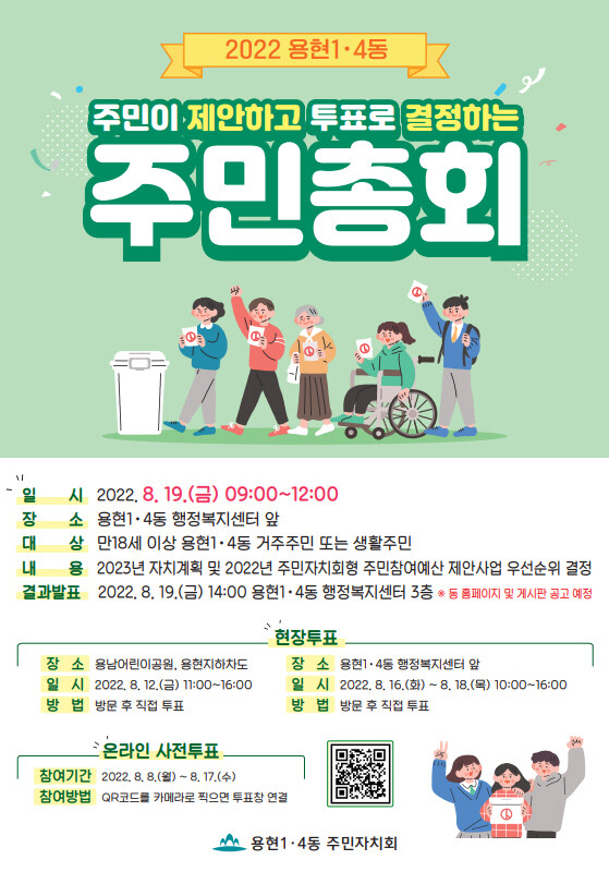 정연건 용현1,4동 주민자치회장은 “지난해에는 코로나19로 대면 총회를 하지 못해 아쉬운 점이 많았는데 올해에는 모든 주민자치회 위원들이 열의를 가지고 총회 준비에 최선을 다하고 있다”며 “주민들이 2023년도 사업을 직접 결정하는 중요한 행사인 만큼 용현1,4동 주민들 많은 관심과 참여를 부탁드린다”고 말했다.