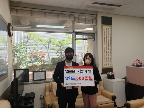 정문순 씨와 한기성 씨는 중국을 왕래하는 사업가로 조카 정영훈 씨가 근무하고 있는 학익2동 행정복지센터에 저소득 가정을 위한 장학금 500만원을 기부했다.