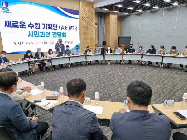 이날 간담회에는 기업인, 사회적경제 관계자, 소상공인 등 17명과 차보용 새로운 수원기획단 경제분과 위원장을 비롯한 경제분과 위원, 수원시 공직자 등이 참석했다.