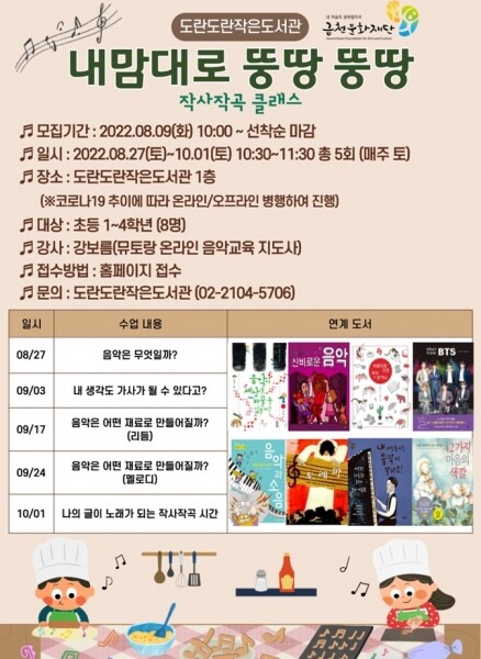 오진이 금천문화재단 대표이사는 “이번 강좌는 세상에 단 하나뿐인 자신만의 곡을 직접 만들어 볼 수 있는 특별한 기회”며 “어린이들이 음악과 연계된 도서를 통해 음악을 배우고 독서의 매력도 알아가는 시간이 되길 기대한다”고 전했다.