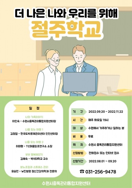 수원시 관계자는 “매년 절주학교 프로그램을 운영해 25기 과정까지 완료하고 300여명의 수료자를 배출했다”며 “올바른 음주문화를 확산하고 알코올 문제없는 건강한 가정과 지역사회를 조성하기 위한 이번 교육에 많은 참여를 부탁드린다”고 말했다.