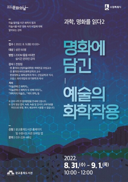 수원시 광교홍재도서관 홈페이지 ‘통합예약/신청→독서문화프로그램’에서 ‘경기도 문화의 날 ‘과학, 명화를 읽다 2: 명화에 담긴 예술의 화학작용’’을 선택해 신청하면 된다.