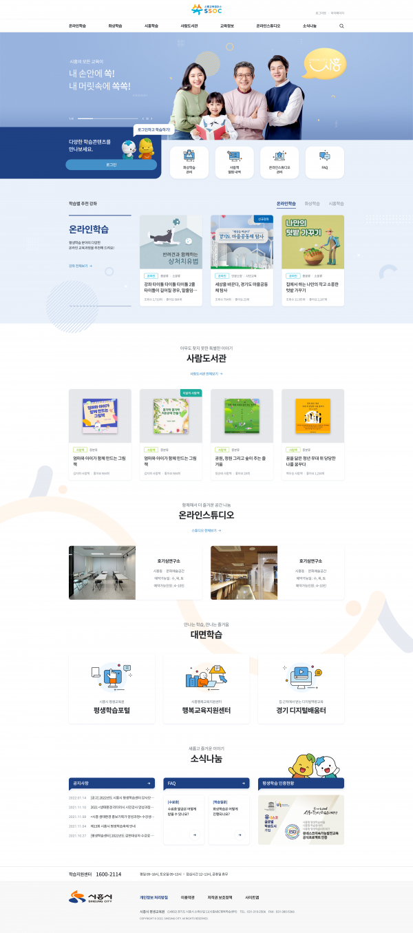 지난 5월, 9개 분야 1,000여 개 전문 교육 콘텐츠를 제공하는 온라인 학습 서비스를 시작으로 9일부터 실시간 참여와 소통이 가능한 화상학습 시흥의 인적·물적 교육 자원을 연계한 시흥학습 사람이 책이 되어 독자와 소통하는 사람도서관 시흥에서 이뤄지는 다양한 온오프라인 교육을 한눈에 볼 수 있는 교육정보 기능을 추가로 제공해 시흥시민 누구나 소외됨 없이 학습의 기회를 누릴 수 있게 됐다.