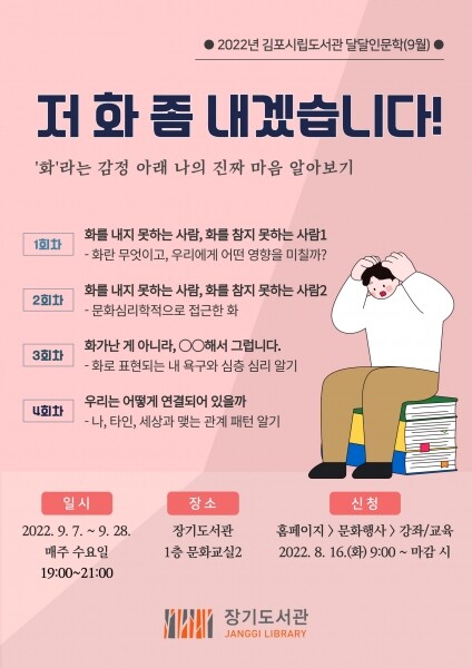 김포시 장기도서관은 9월 달달 인문학 강의 ‘저 화 좀 내겠습니다’를 9월 7일부터 9월 28일 저녁 19시부터 오후 9시까지 장기도서관 문화교실2에서 진행한다.