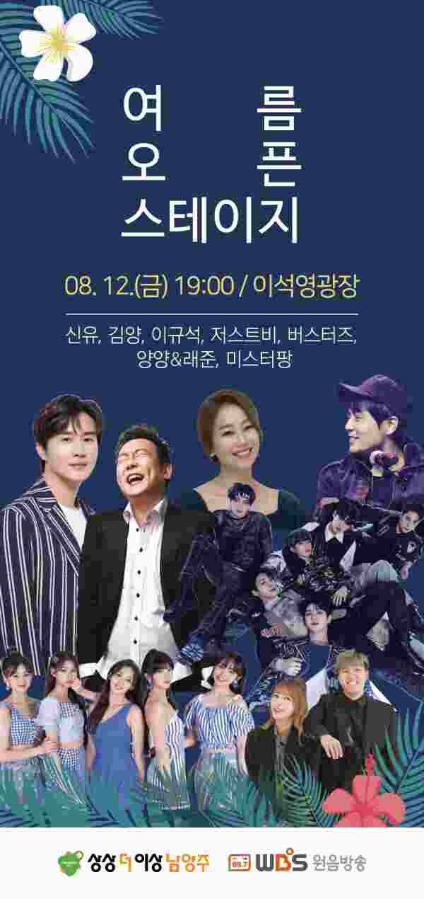 이번 공연은 WBS원음방송‘Summer Open Stage in 남양주’특집 공개방송으로 ‘잠자는 공주’, ‘시계바늘’로 큰 인기를 받은 트로트계 황태자 신유 TV조선 내일은 미스트롯에서 ‘우지마라’로 심사위원 올 하트를 받은 김양 80년대 원조 꽃미남 가수이자 기차와 소나무로 유명한 이규석 등이 출연한다.