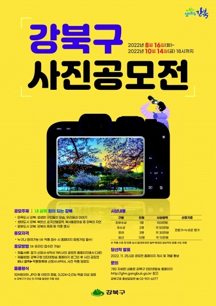 생생한 구민들의 모습, 우리동네 이야기, 북한산, 북서울꿈의 숲 등 강북의 자연, 지역 축제 등의 사진을 찍어 제출하면 된다.