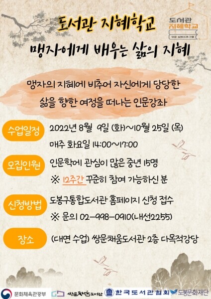 오언석 도봉구청장은 “앞으로도 구립도서관에서 주민들이 쉽게 양질의 인문 교양 강좌를 들을 수 있도록 다양한 프로그램들을 마련해 나가겠다”고 전했다.