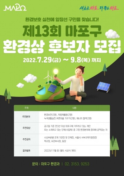 박강수 마포구청장은 “녹색 생활을 몸소 실천하고 있는 숨은 공로자가 있다면 적극적으로 추천해 주시길 부탁드린다”고 말했다.