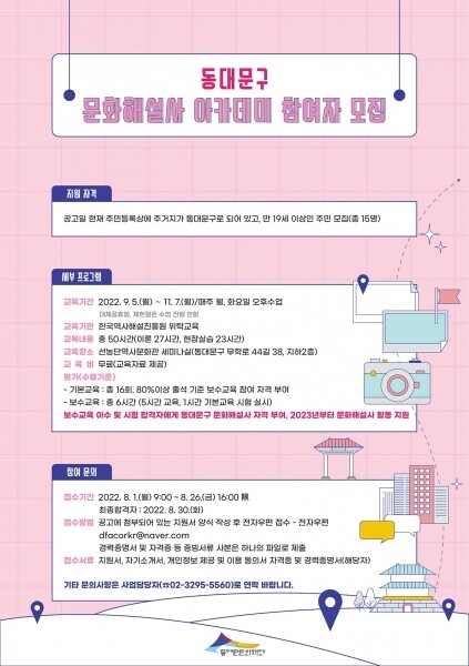 교육은 9월 5일부터 11월 7일까지 매주 월요일 화요일 오후에 진행되며 동대문구에 거주하는 19세 이상 주민 누구나 참여 가능하다.