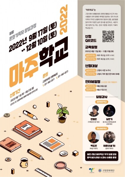 [뉴스써치] 고양특례시 산하 고양문화재단 생활문화센터는 오는 8월 11일부터 22일까지 2022 문화기획자 양성아카데미 ‘마주학교’ 참여자를 모집한다.