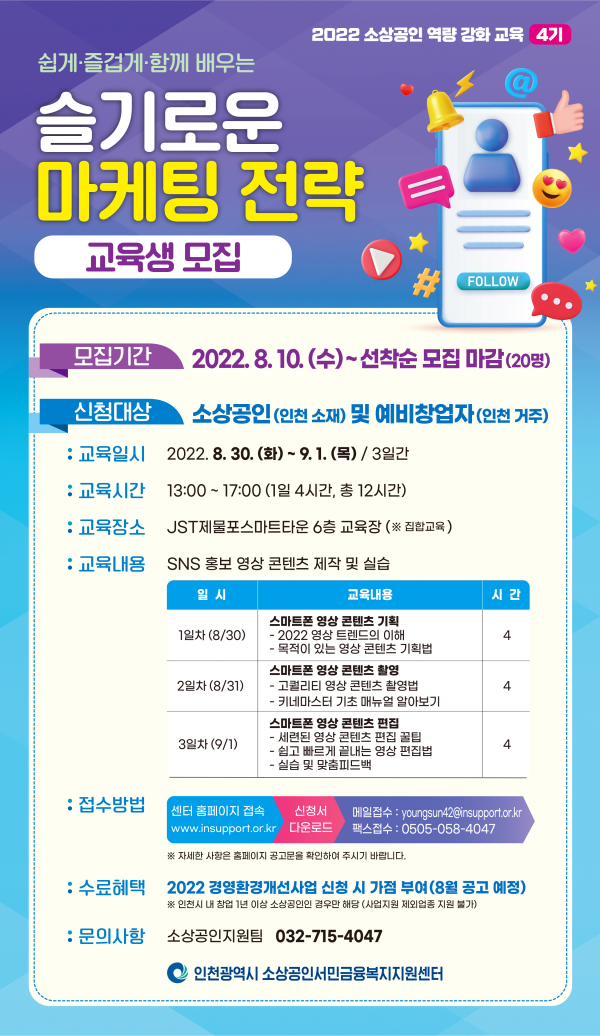 인천광역시는 관내 소상공인 및 예비창업자들을 대상으로 ‘사회관계망서비스 홍보 영상 콘텐츠 제작 및 실습’ 과정을 오는 8월 30일부터 9월 1일까지 3일간 진행한다고 밝혔다.