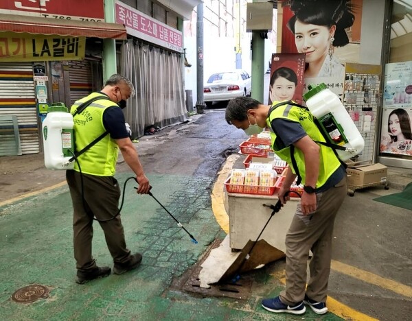 이날 구는 여름철 기온이 가장 높은 오후 2시~4시를 피해 2시간 이내로 방역소독을 실시하고 폭염 시 방역소독 활동 자제를 주민자율방역단에 당부하면서 물품을 전달했다.