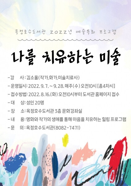 시 도서관 관계자는 “이번 프로그램은 옥정호수도서관에서 추진하는 첫 특화주제 강좌로 책과 예술을 접목한 특별한 시간이 될 수 있도록 심혈을 기울여 기획했다”며 “코로나19 등으로 심신이 지친 시민들의 마음에 깊이 와닿는 치유의 프로그램이 되길 바란다”고 말했다.