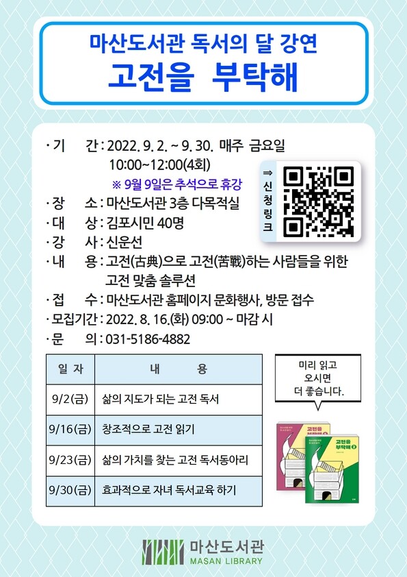 [뉴스써치] 김포시 마산도서관은 2022년 독서의 달을 맞아 ‘고전을 부탁해’를 오는 9월 2일부터 9월 30일 매주 금요일 10시에서 12시까지 4회에 걸쳐 운영한다.