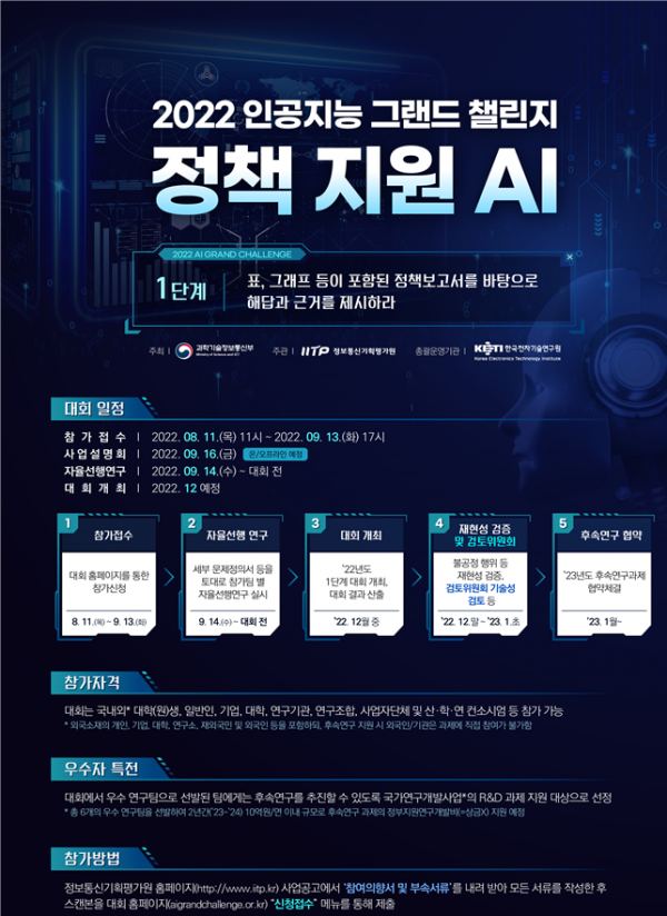 그 시작을 알리는 2022년 1단계 대회는 정책지원 인공지능 기술개발에 필요한 연구역량을 경쟁하기 위해 ‘표, 그래프 등이 포함된 정책보고서를 바탕으로 해답과 근거를 제시하라’라는 문제를 출제해 인공지능을 활용한 표, 그림, 언어 등의 이해 및 이를 바탕으로 한 복합추론 기술을 겨루게 된다.