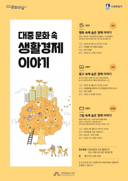 수원시 관계자는 “대중문화 속 다양한 소재로 일상에 스며있는 경제원리와 지식을 쉽게 풀어낸 강의”며 “시민들의 경제인문학적 소양을 함양하기 위해 준비한 만큼 많은 참여 부탁드린다”고 말했다.