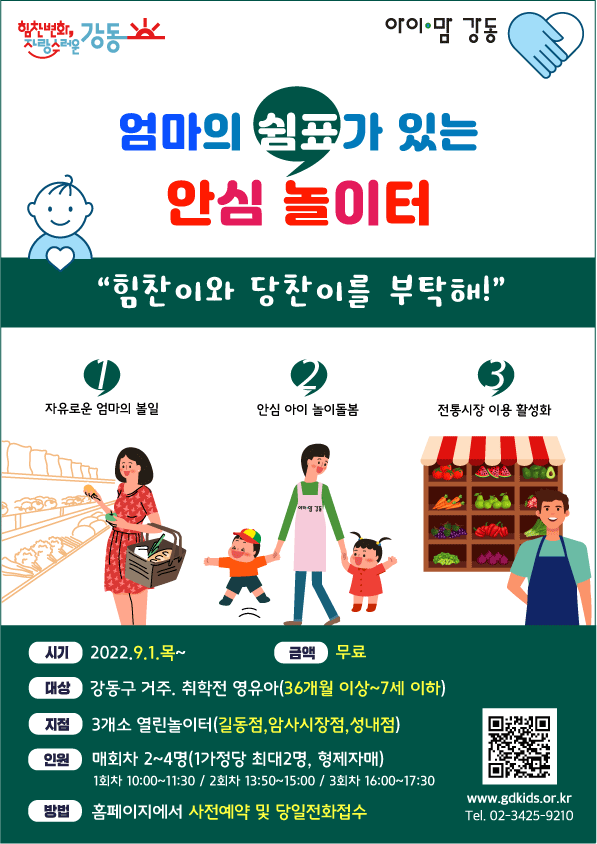 이 서비스는 9월 1일부터 시범 운영을 시작하며 엄마들 사이에서 핫플레이스로 이미 유명한 ‘아이맘 강동’ 열린놀이터 3개소에서 만나볼 수 있다.