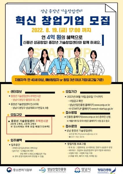 ‘성남 중장년 기술창업센터’는 중장년 창업자의 기술창업 활성화를 지원해 유망 중장년 기술창업기업을 발굴하는 곳으로 입주공간 지원 교육·간담회 운영 등 사업화를 지원한다.