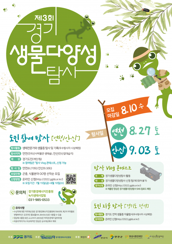 이번 행사는 ‘자연을 위한 모두의 관심 경기생물다양성탐사’를 주제로 열리는데 도민이라면 누구나 경기생물다양성탐사 홈페이지를 통해 참여 신청할 수 있다.