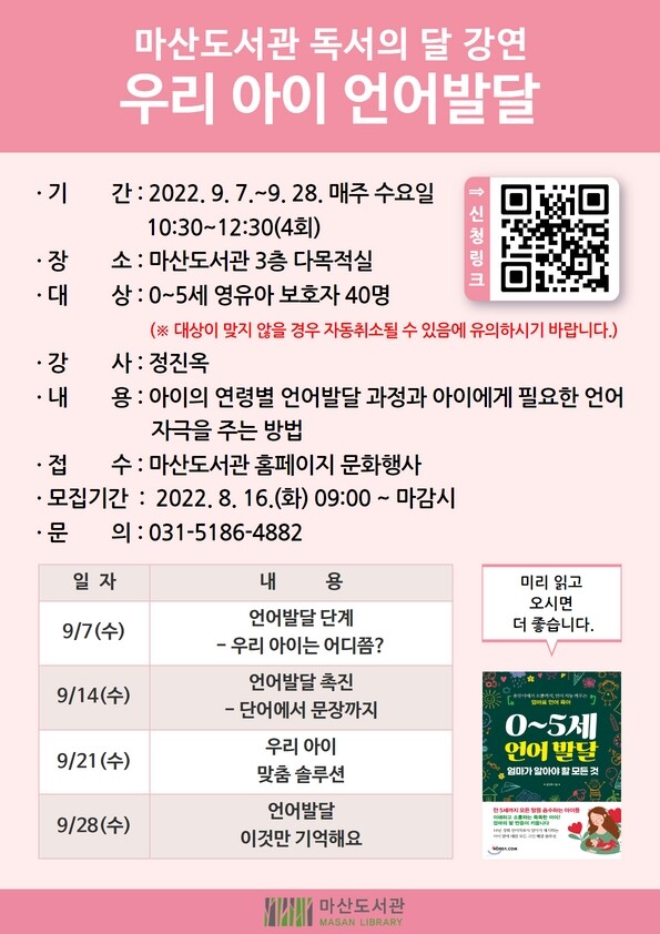 1주차는 ‘언어발달 단계’, 2주차는 ‘언어발달 촉진’, 3주차는 ‘우리 아이 맞춤 솔루션’, 4주차는 ‘언어발달 이것만 기억해요’로 구성되며 본 강의는 0~5세 영유아 보호자를 대상으로 하는 강의로 자세한 내용은 마산도서관 홈페이지 문화행사 신청에서 확인할 수 있다.