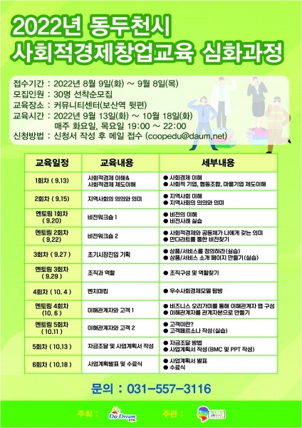 동두천시장은 “이번 교육을 통해 사회적경제에 대한 시민들의 관심을 제고하고 관내 우수한 예비 사업가를 양성·발굴할 수 있기를 기대한다”며 “시에서도 창업하고자 하는 시민들을 위해 적극적으로 협조하겠다”고 전했다.