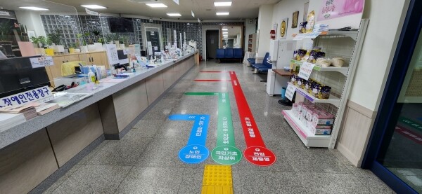 유도선은 행정복지센터를 방문하는 시민 누구나 쉽게 업무 창구를 찾아 민원 업무를 볼 수 있도록 눈에 잘 띄는 색과 큰 글씨를 적용해 사회적 약자의 이용 편의 증진을 도모했다.
