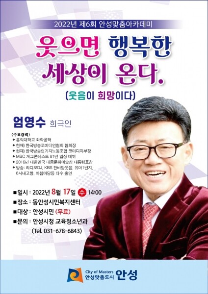 이번 아카데미는 희극인 엄영수 씨가 초빙돼 ‘웃으며 사는 행복한 세상’이라는 주제로 강연을 진행한다.