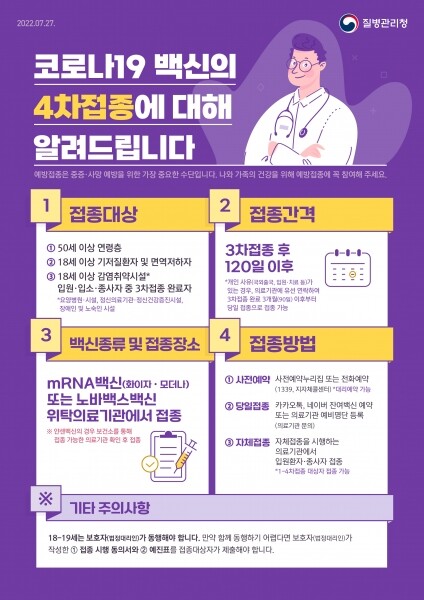 코로나 4차 접종 대상은 지난 7월 18일부터 기존 60대 이상 대상자에서 50세 이상 전 연령층과 18세 이상 면역저하자, 기저질환자, 감염취약시설 입원입소자 종사자로 확대 실시되고 있다.