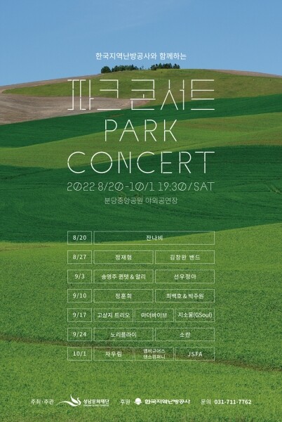 ‘2022 파크콘서트’는 오는 8월 20일부터 10월 1일까지 7주간 매주 토요일 오후 7시 30분 분당 중앙공원 야외공연장에서 펼쳐진다.